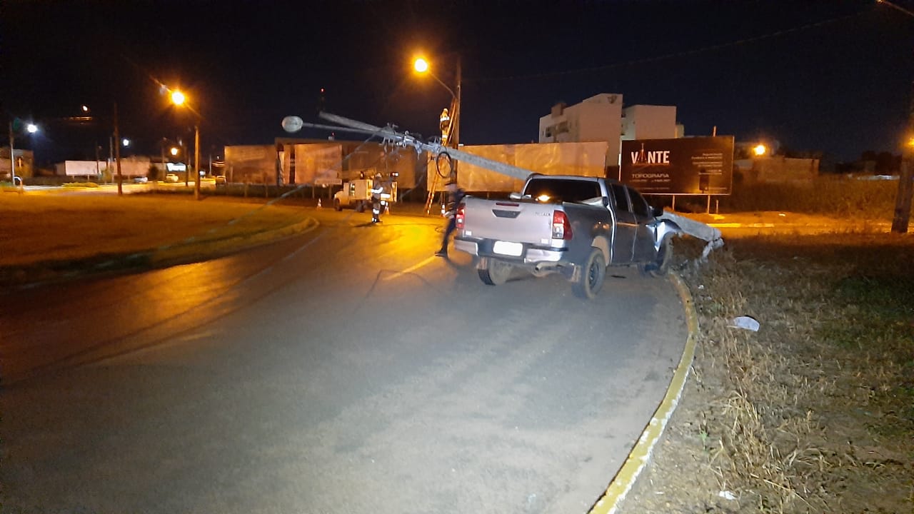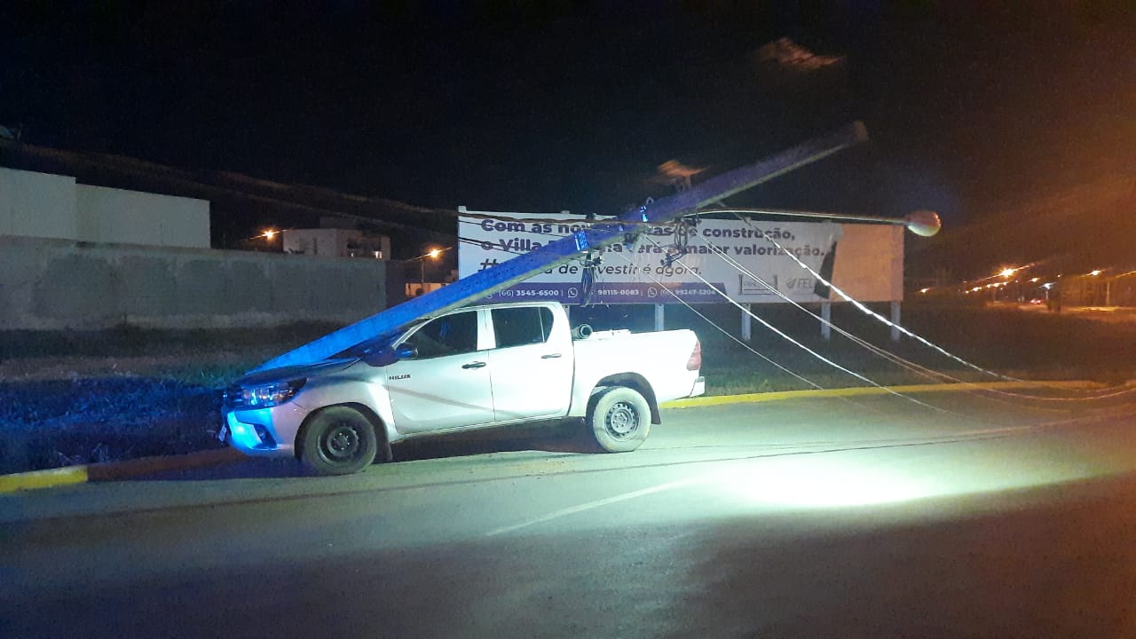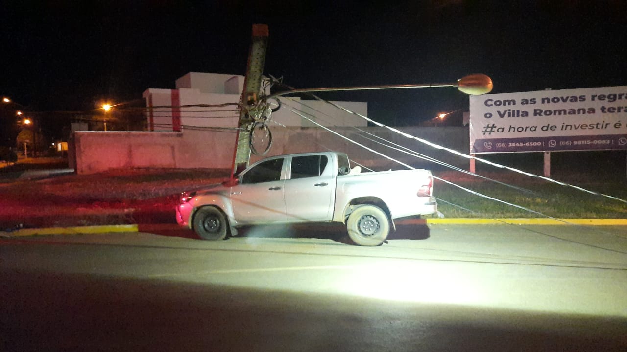 O acidente aconteceu na avenida Brasil, cruzamento com a rua São Lucas, em Sorriso na noite dessa quarta-feira (06/04). De acordo com informações apuradas no local, a caminhonete Hilux trafegava pela Brasil sentido, a área central da cidade, quando, o condutor perdeu o controle da direção, e atingiu um poste de iluminação pública, que caiu sobre o veículo.
