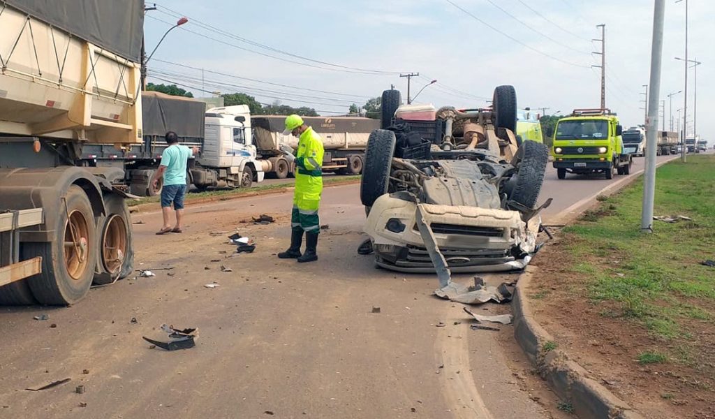 Com impacto, no último vagão da carreta, a caminhonete tombou e ficou com as rodas para o alto. Um pneu traseiro da carreta estourou com o impacto. Ela estava carregada e iniciaria o contorno na rotatória quando houve o acidente.