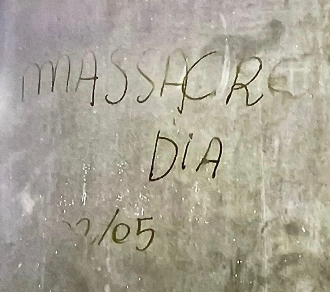 A frase “Massacre 2/05” estava na parede de um dos banheiros da unidade educacional.