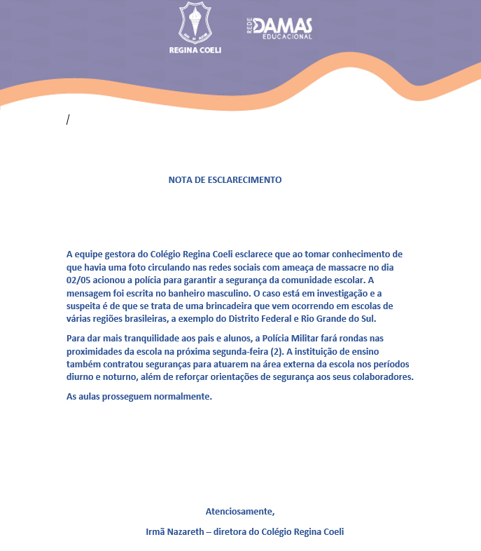 A equipe gestora do Colégio Regina Coeli esclarece que ao tomar conhecimento de que havia uma foto circulando nas redes sociais com ameaça de massacre no dia 02/05 acionou a polícia para garantir a segurança da comunidade escolar. A mensagem foi escrita no banheiro masculino. O caso está em investigação e a suspeita é de que se trata de uma brincadeira que vem ocorrendo em escolas de várias regiões brasileiras, a exemplo do Distrito Federal e Rio Grande do Sul.