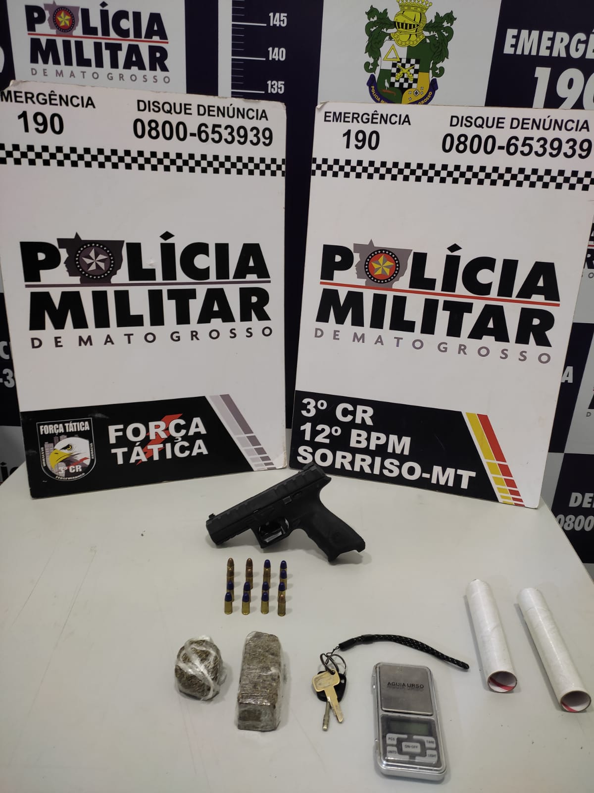 Na casa estava apenas a mãe de um dos suspeitos que permitiu a entrada da equipe na residência. Durante as buscas foram localizadas uma arma 9mm, munições calibre 9mm e entorpecentes.