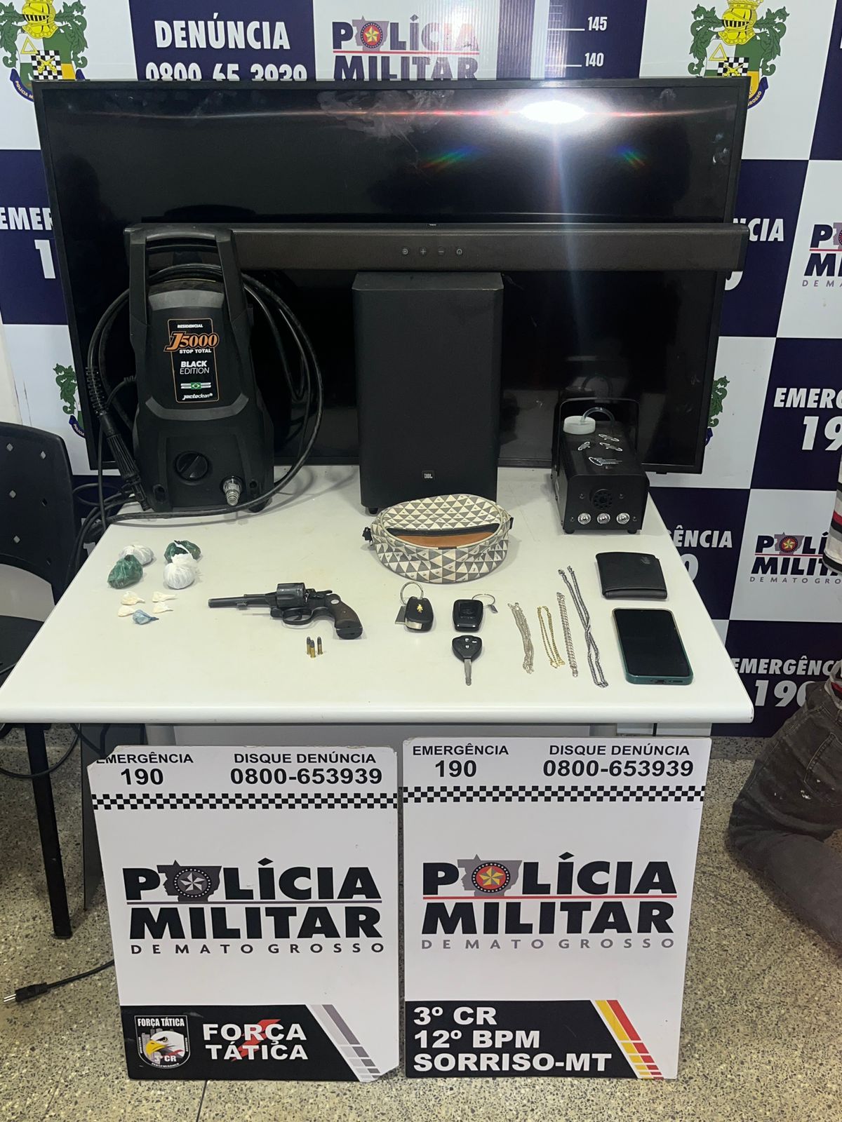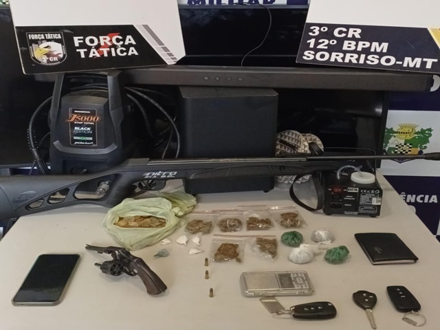Em resumo, os materiais apreendidos com os homens foram 01 revolver calibre 22, 03 munições, 10 invólucros de maconha, 05 invólucros de pasta base de cocaína, 01 TV Samsung, 01 espingarda de pressão, 01 balança de precisão, 01 conjunto de home theater, 01 jato clean, 01 veículo Onix e 01 veículo Corolla.