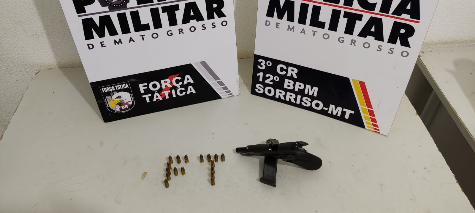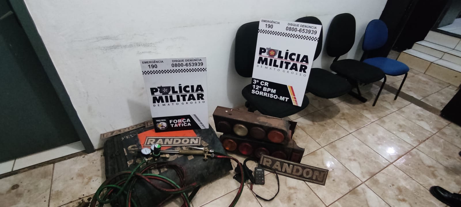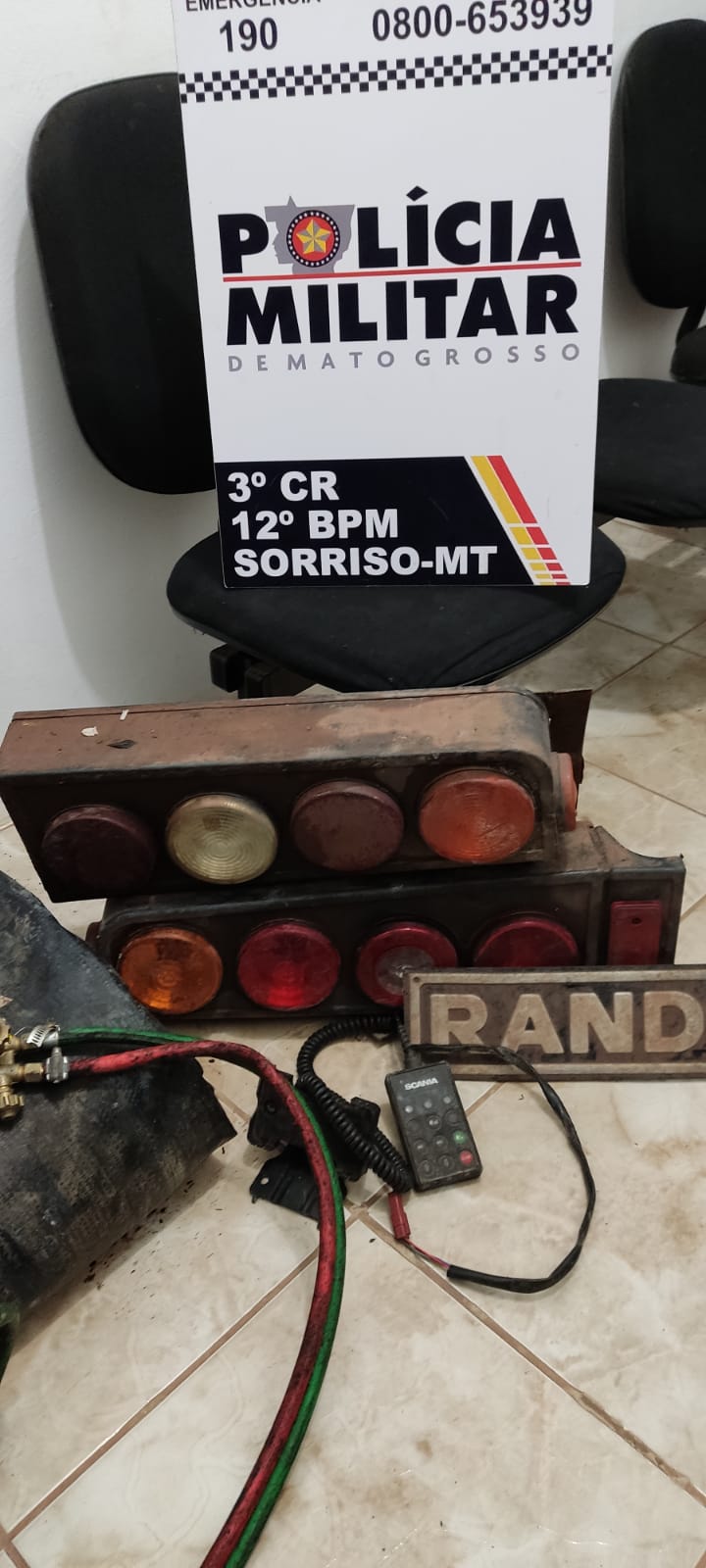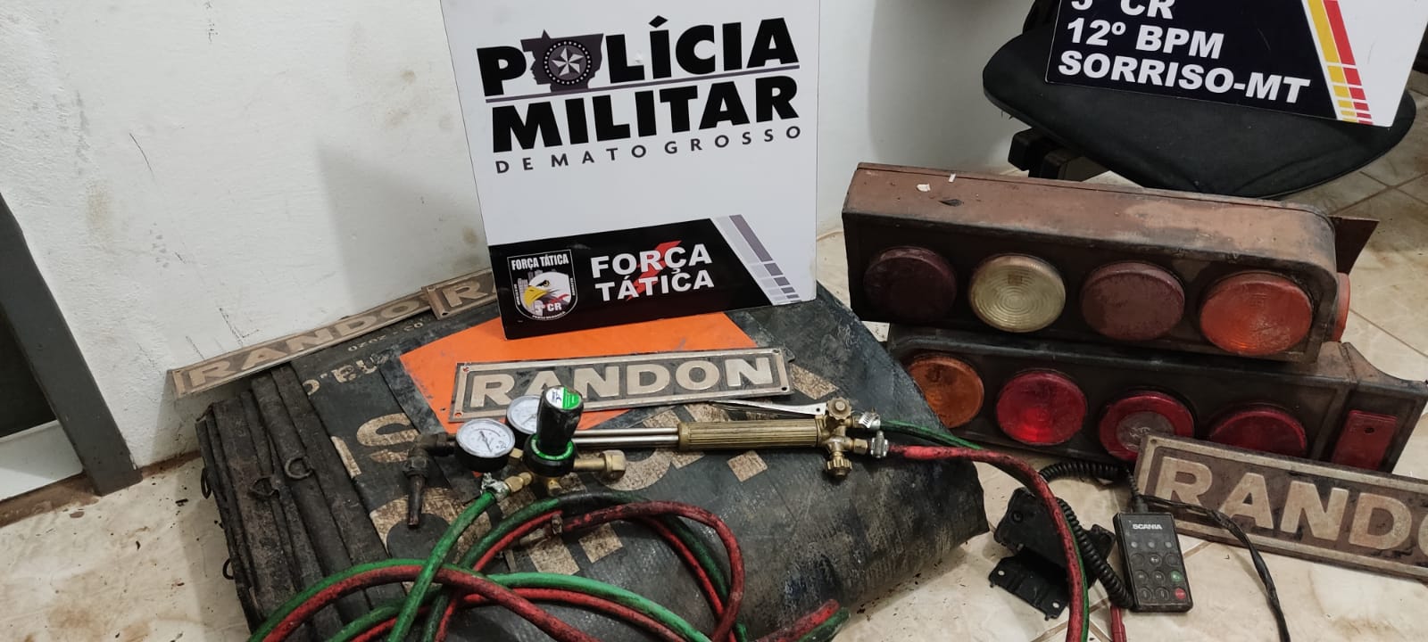 Foram apreendidos uma pistola de Marca Bersa .9mm (com numeração suprimida); 17 Munições de .9mm intactas; 01 Lona de carreta; 04 lanternas traseiras de caminhão/carreta; 01 Maçarico; 01 Controle de Caçamba.