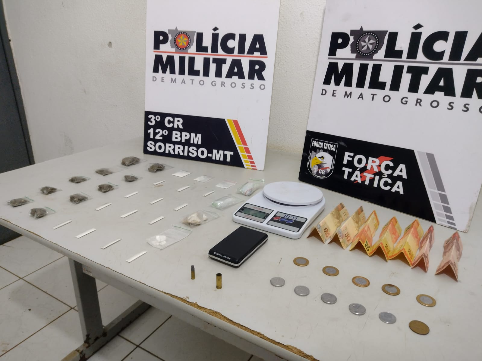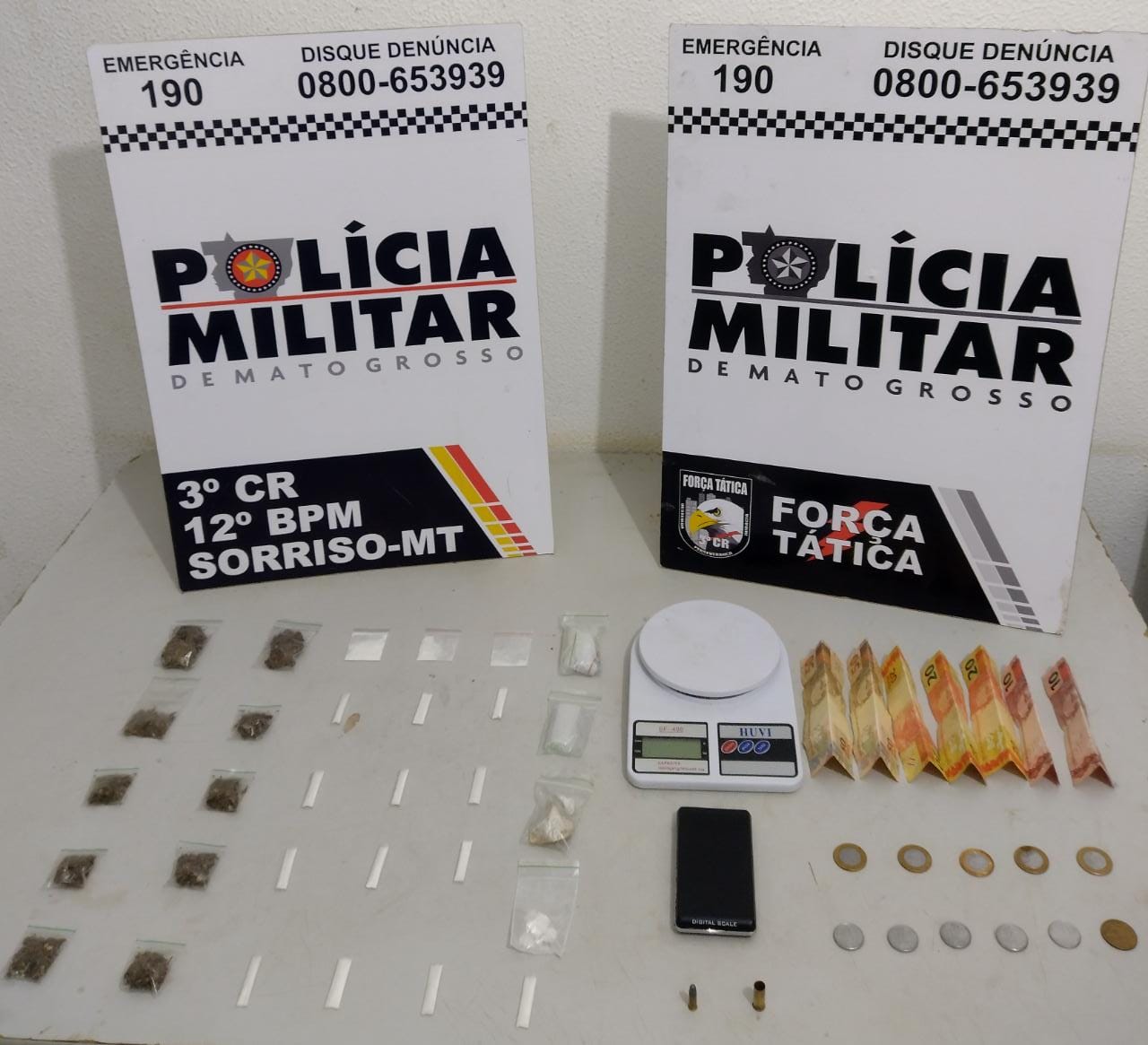 Foram apreendidos 10 (dez) Porções de substância similar a maconha; 17 (Dezessete) Porções de substância similar a Cocaína; 02 (duas) Porções de substância similar a pasta base de cocaína; 02 (duas) Balanças de precisão; 01 (um) Munição intacta de Calibre.22; 01 (um) Munição deflagrada Calibre .32; R$ 187,75 (cento e oitenta e sete reais e setenta e cinco centavos) em moeda corrente.