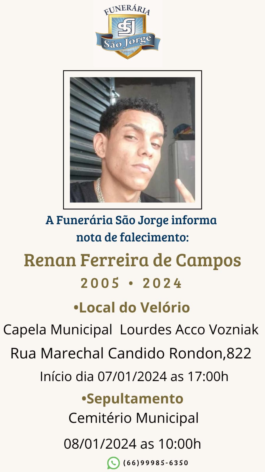 Renan Ferreira de Campos, de 18 anos, que morreu após ser baleado por volta das 03h00 deste domingo (07/01), está sendo velado na Capela Mortuária atrás do Hospital Regional e será sepultado às 10:00h desta segunda-feira (08/01).