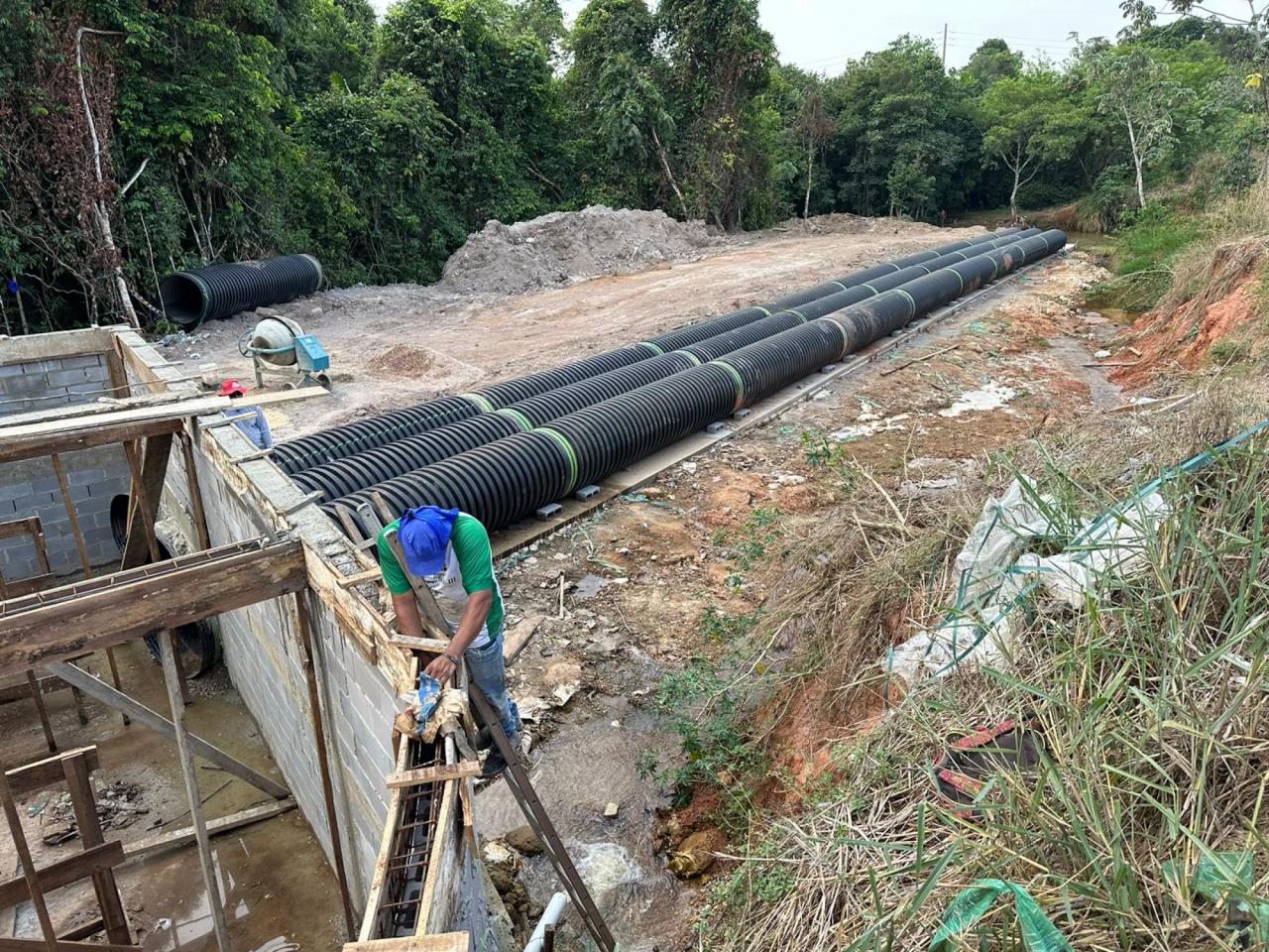 Com equipes próprias, a Prefeitura de Sorriso segue com o trabalho de reforço da drenagem de águas pluviais na região do Parque Municipal Rota do Sol Adelino José João Valdameri. Até outubro, estima o secretário de Obras e Serviços Públicos (Semosp), Milton Geller, deve ser concluído o trabalho de instalação de três fileiras de tubos de polietileno (PEAD) de um metro de diâmetro, uma caixa de captação e uma caixa para dissipação da água, perfazendo um total de 60 metros da infraestrutura.