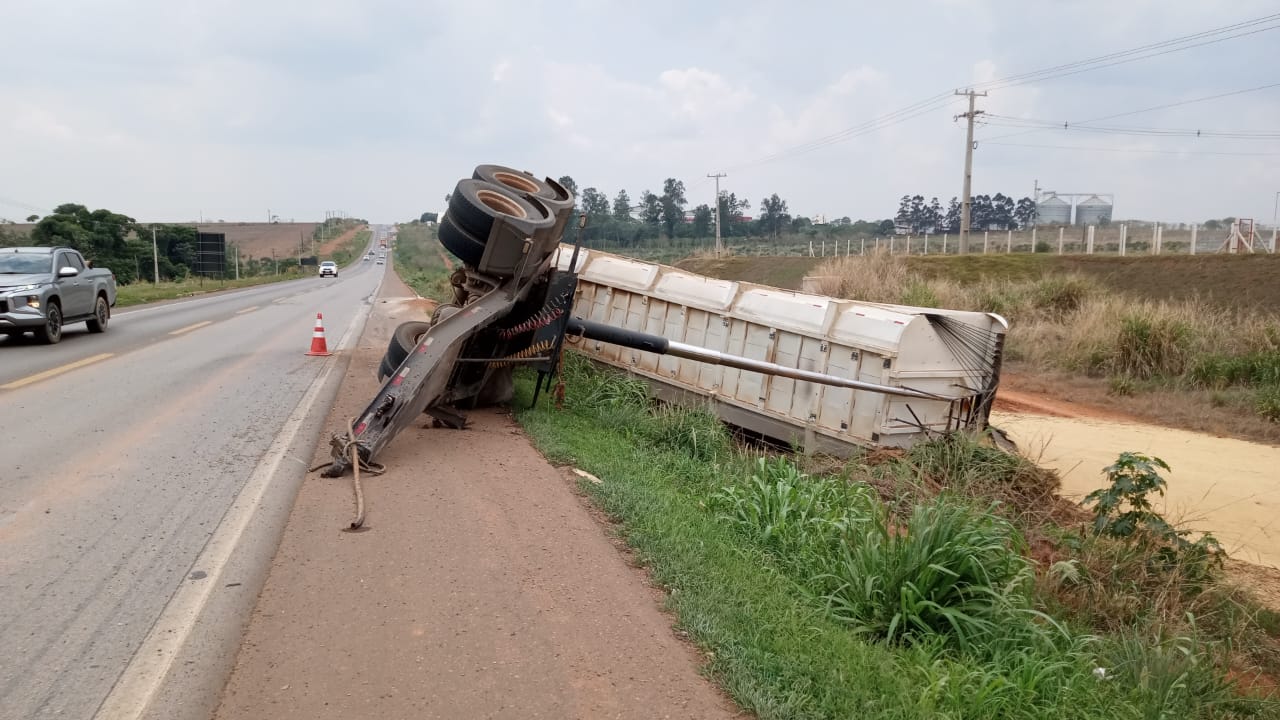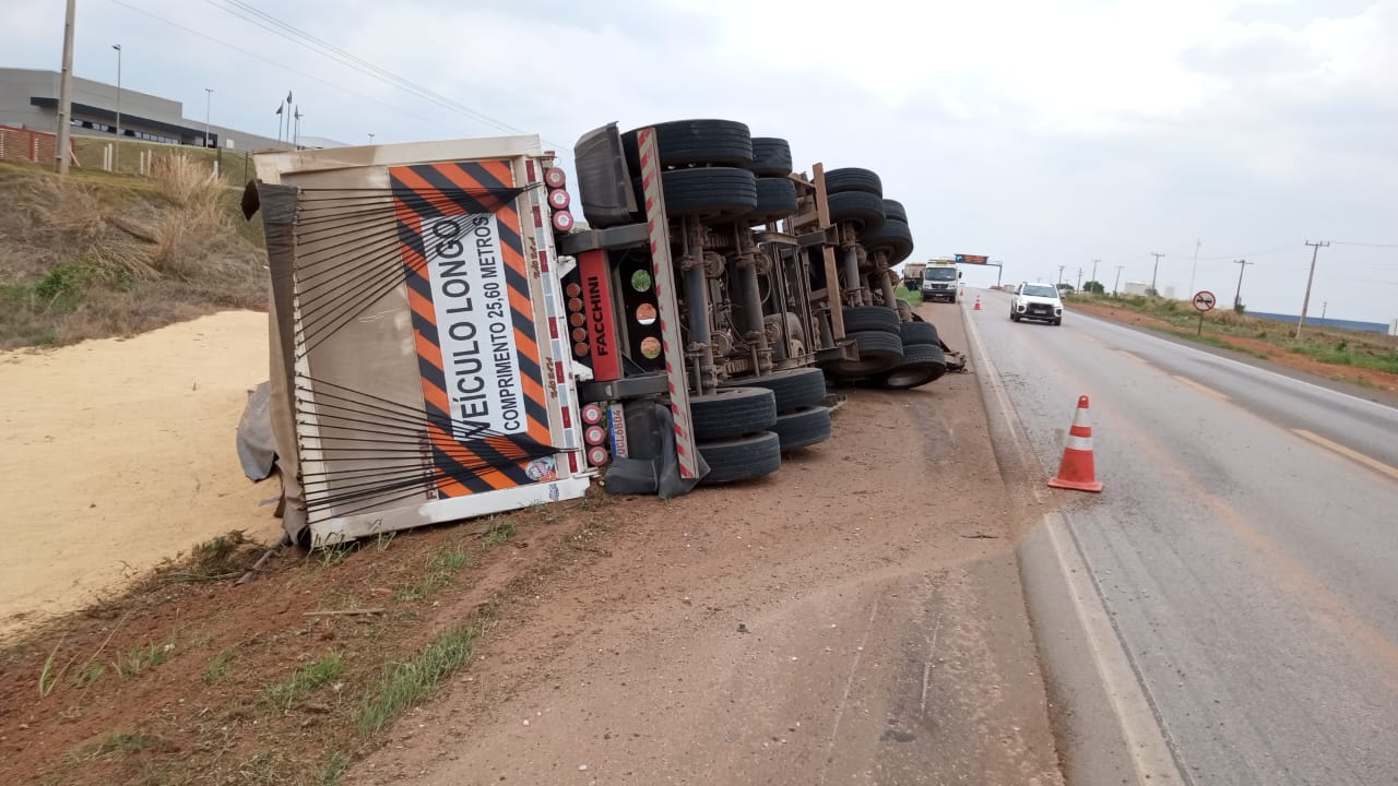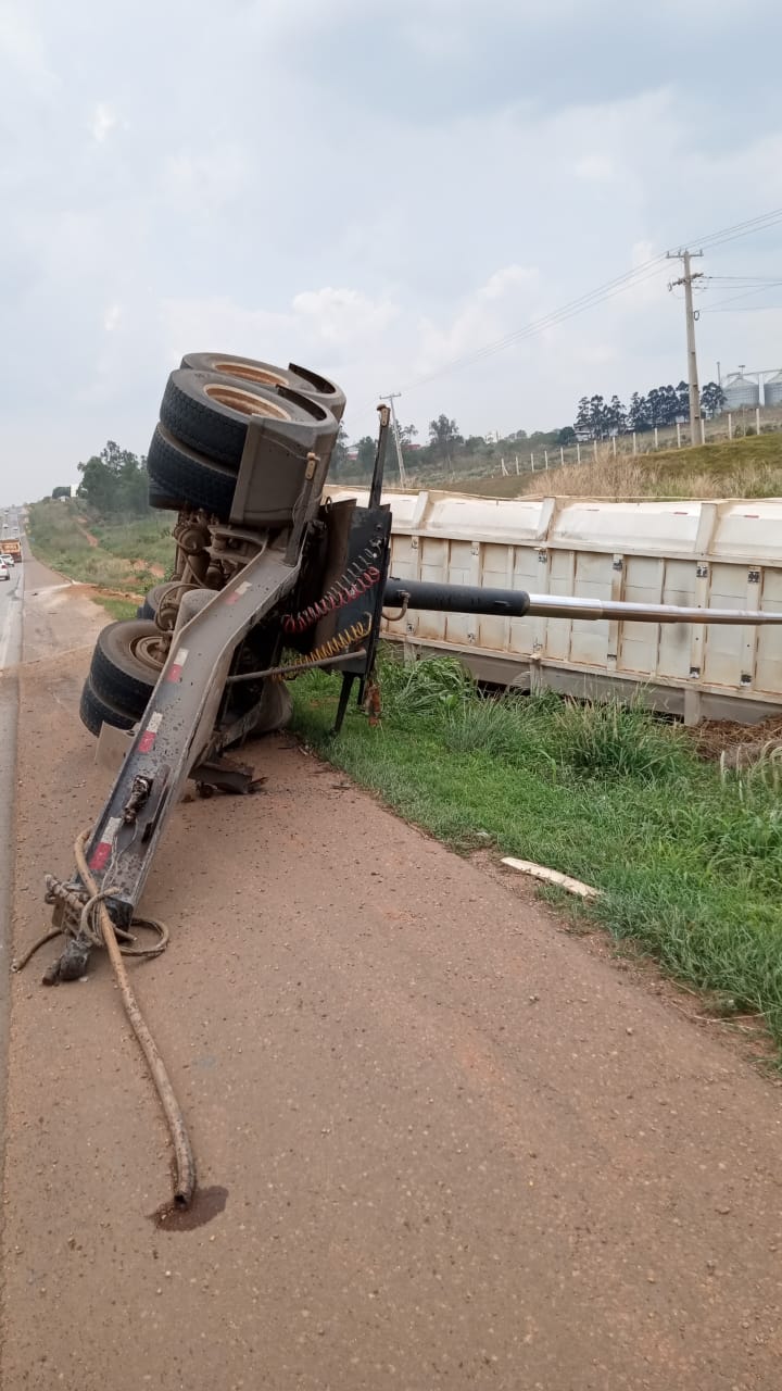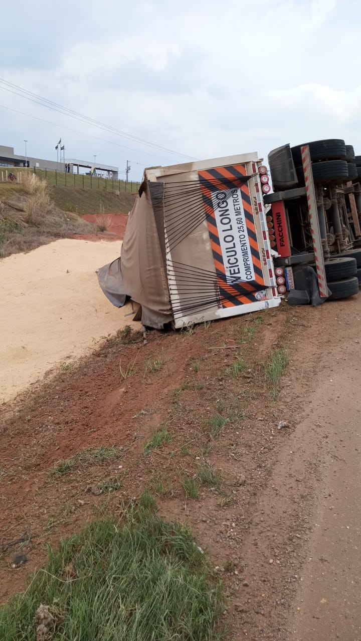 As informações iniciais apontam que o condutor da carreta Man TGX branca, placa Brasil, freou para não colidir com outro veículo e o segundo vagão tombou em faixa de domínio.